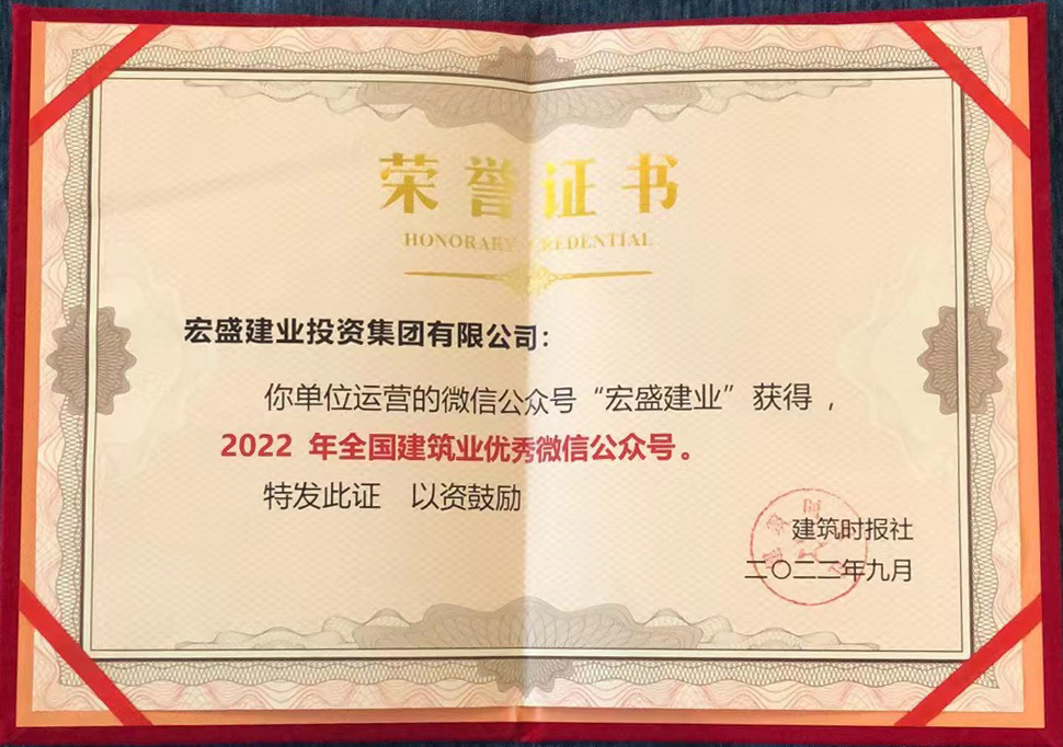 9月25日,由建筑時報社主辦的2022年建筑業(yè)微信公眾號運維經(jīng)驗交流研討會暨全國建筑業(yè)優(yōu)秀公眾號頒獎典禮在湖北省武漢市舉辦。集團微信公眾號——“宏盛建業(yè)”榮獲“2022年全國建筑業(yè)優(yōu)秀微信公眾號”稱號。