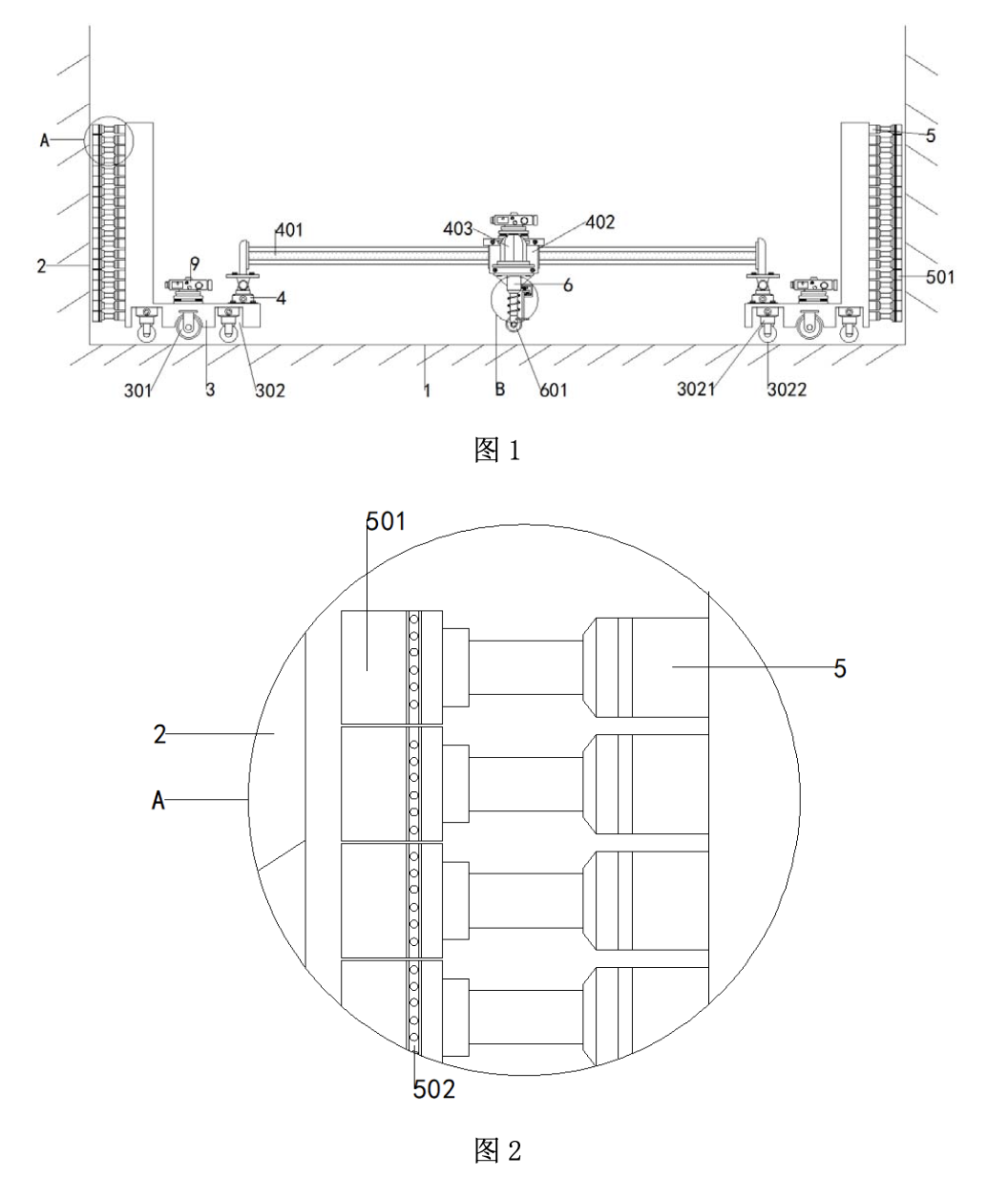 本實用新型中,通過設(shè)置地面平坦度檢測結(jié)構(gòu),通過使警報器、彈簧伸縮桿、滾輪B、支撐桿、觸發(fā)板、安裝架、微動開關(guān)A、微動開關(guān)B之間配合使用,可以對地面的凸起和凹陷均進(jìn)行檢測,提高了對地面平坦度檢測的效率和速度。