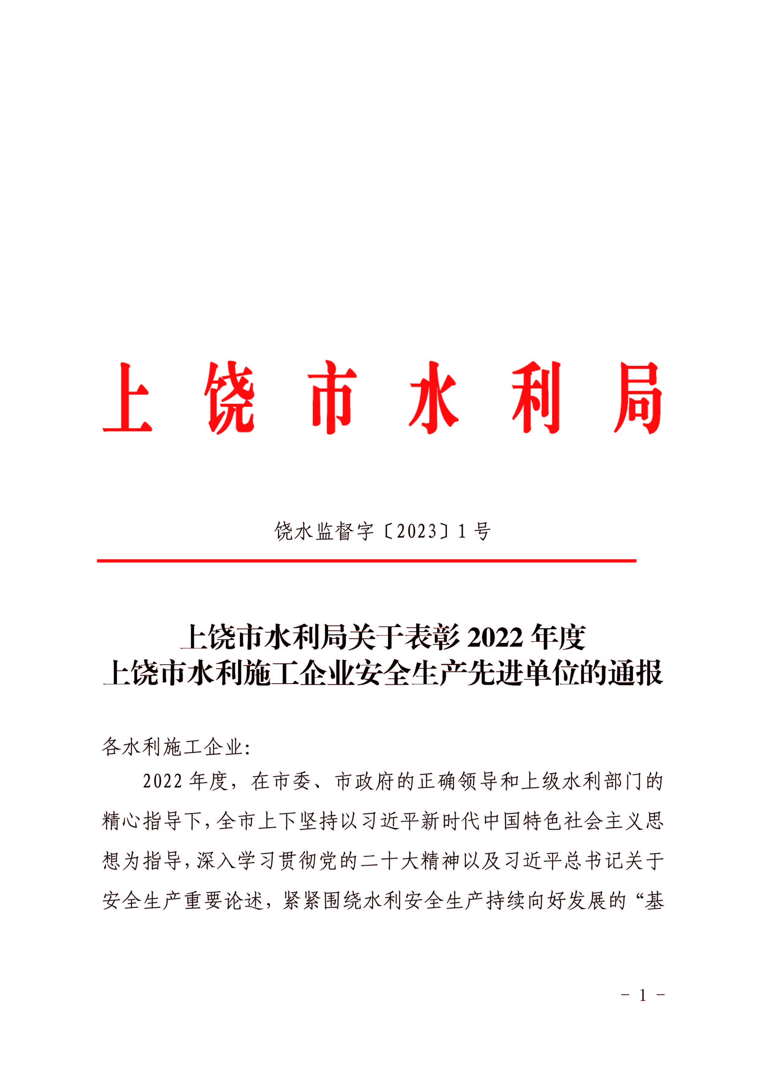 近日,上饒市水利局饒水監(jiān)督字〔2023〕1號(hào)中公布了關(guān)于表彰2022年度上饒市水利施工企業(yè)安全生產(chǎn)先進(jìn)單位的通報(bào)。我集團(tuán)憑借切實(shí)加強(qiáng)安全生產(chǎn)管理,明確安全生產(chǎn)責(zé)任,筑牢安全生產(chǎn)“三道線”的原則,獲評(píng)為2022年度上饒市水利施工企業(yè)安全生產(chǎn)先進(jìn)單位。
