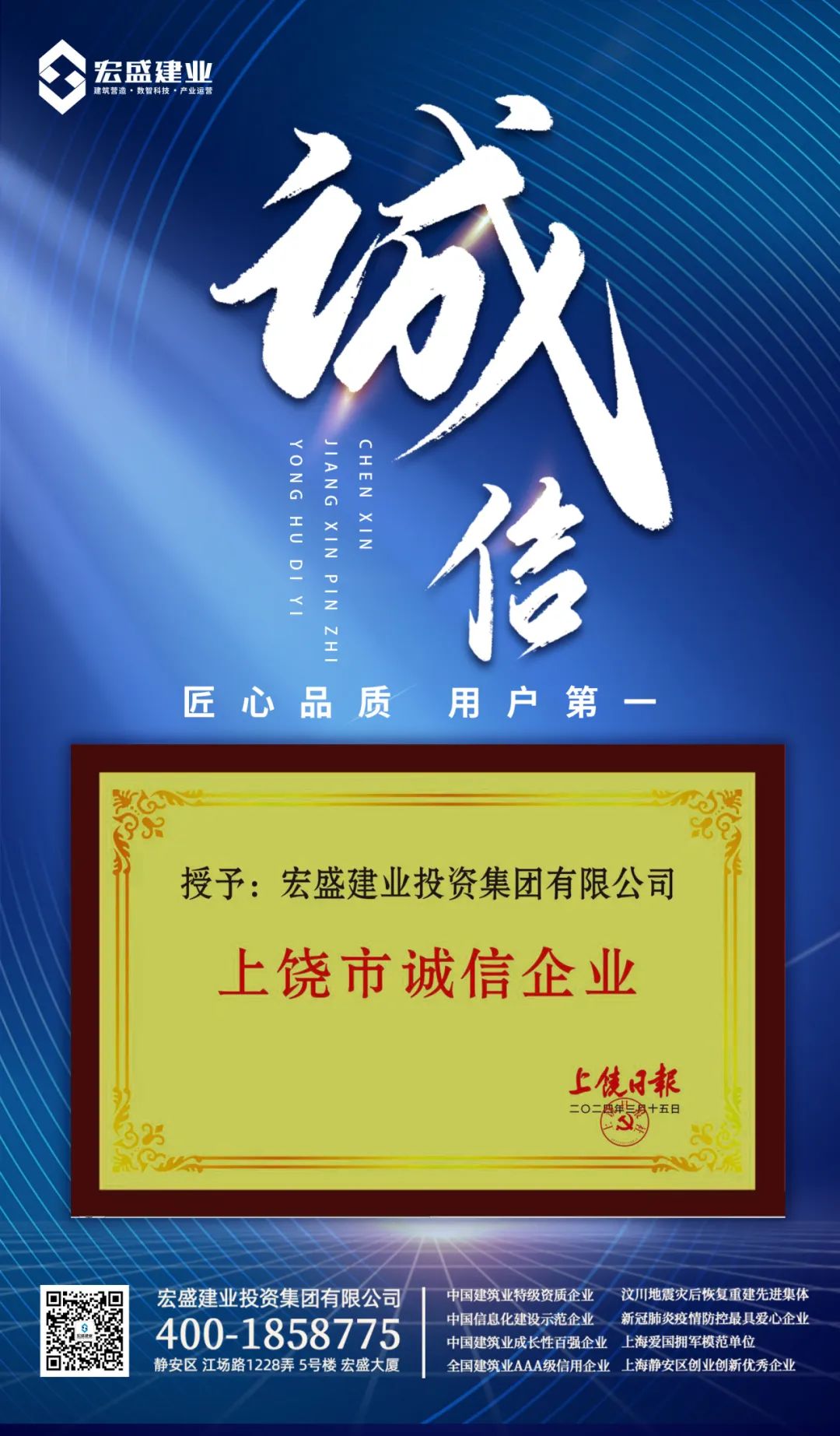 喜訊丨宏盛建業(yè)投資集團再次榮獲“上饒市誠信企業(yè)”殊榮