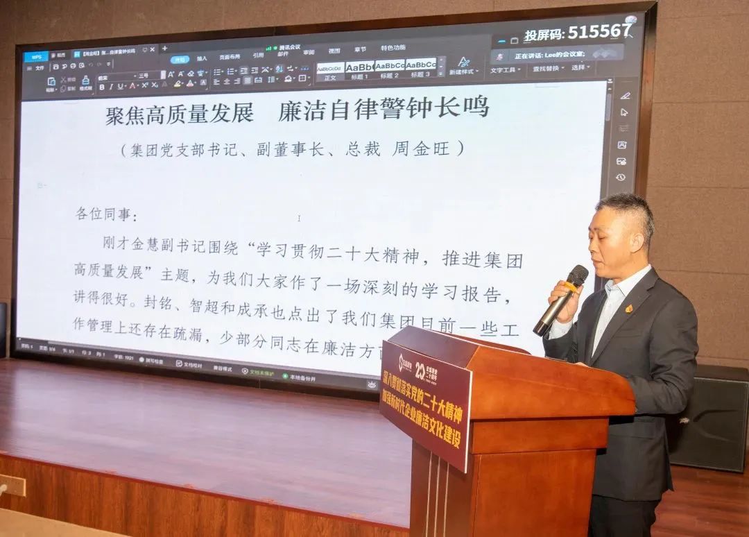 座談會上集團(tuán)黨支部書記、副董事長、總裁周金旺從加強黨員、管理層表率,廉潔自律作為企業(yè)管理的思想核心,抓好“四嚴(yán)”,強化監(jiān)督機制等方面進(jìn)行了要求與督促,并表示通過弘揚廉潔文化,“激濁揚清、扶正祛邪”,有利于進(jìn)一步建立健康向上的企業(yè)文化。我們要不斷建立健全廉潔文化建設(shè)的體制和機制,以制度和規(guī)范相結(jié)合,使廉潔成為一種習(xí)慣,成為一種文化自覺,營造清明、清朗、清新的良好企業(yè)生態(tài)。