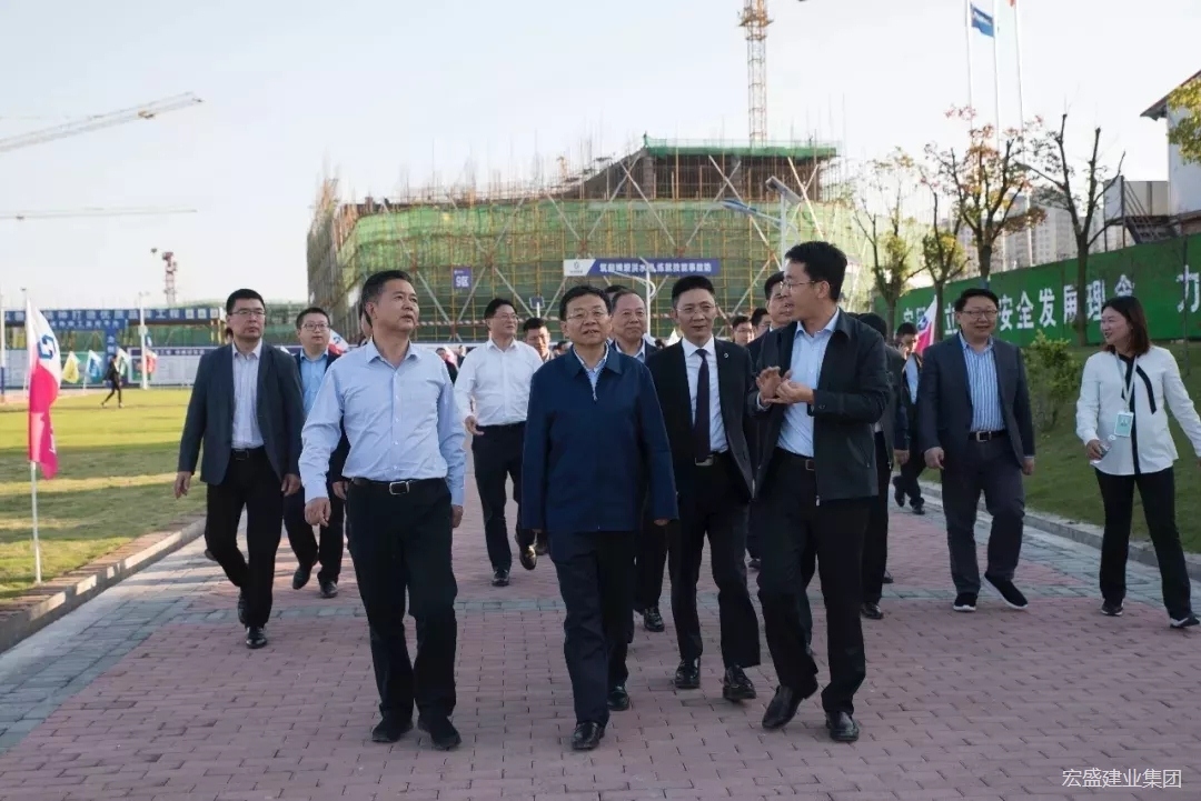 江西省委常委、副省長劉強(左五)、上饒市委書記馬承祖(左四)、上饒市市長謝來發(fā)(右二)、江西省住建廳黨組成員、總工程師章雪兒(左三)、上饒市副市長李高興(左二)、上饒市副市長兼上饒高鐵經(jīng)濟試驗區(qū)黨工委第一書記王萬征(右一)、宏盛建業(yè)投資集團、中國(上饒)建筑科技產(chǎn)業(yè)園有限公司董事長周金虎(右三)