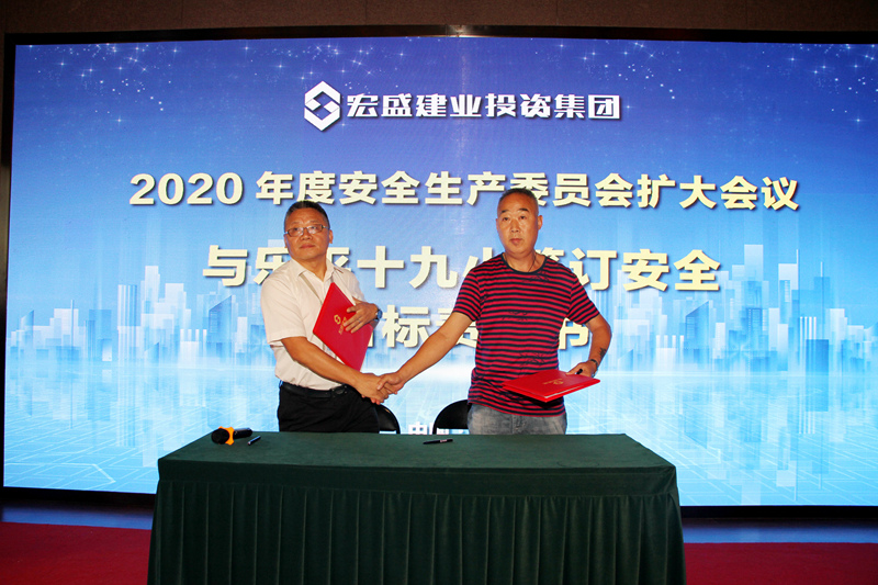 △會上,集團(tuán)副總裁劉旭(左)與樂平十九小學(xué)項(xiàng)目經(jīng)理龍殿水(右)簽訂安全目標(biāo)責(zé)任書