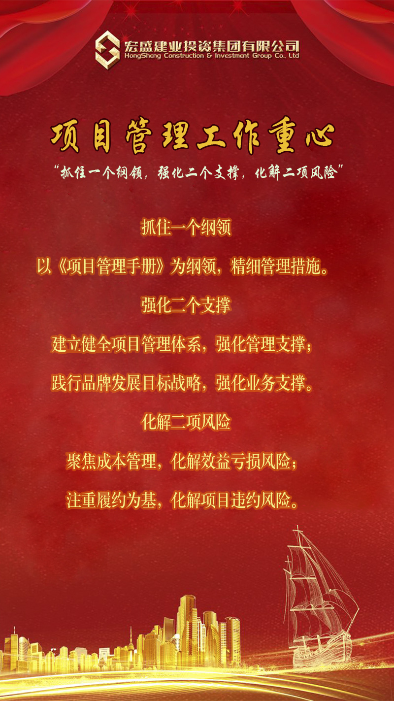 會上,集團(tuán)董事長周金虎指出,項(xiàng)目是我們建筑企業(yè)的立命之本,抓好項(xiàng)目管理是我們企業(yè)生存的根基。他要求,項(xiàng)目管理必須要堅(jiān)持“高起點(diǎn)、高標(biāo)準(zhǔn)、高品質(zhì)”,堅(jiān)持“以質(zhì)量求信譽(yù),以標(biāo)化促形象,以管理提效益”,努力做到“項(xiàng)目必優(yōu)、建一個項(xiàng)目、立一道標(biāo)桿、樹一方品牌”。從VIS形象、工程質(zhì)量、安全文明施工、到客戶服務(wù)、誠信履約全過程把控,把每一個在建項(xiàng)目做成宏盛對外的窗口和名片,向社會展示宏盛優(yōu)質(zhì)產(chǎn)品,為市場經(jīng)營提供優(yōu)質(zhì)業(yè)績支撐。