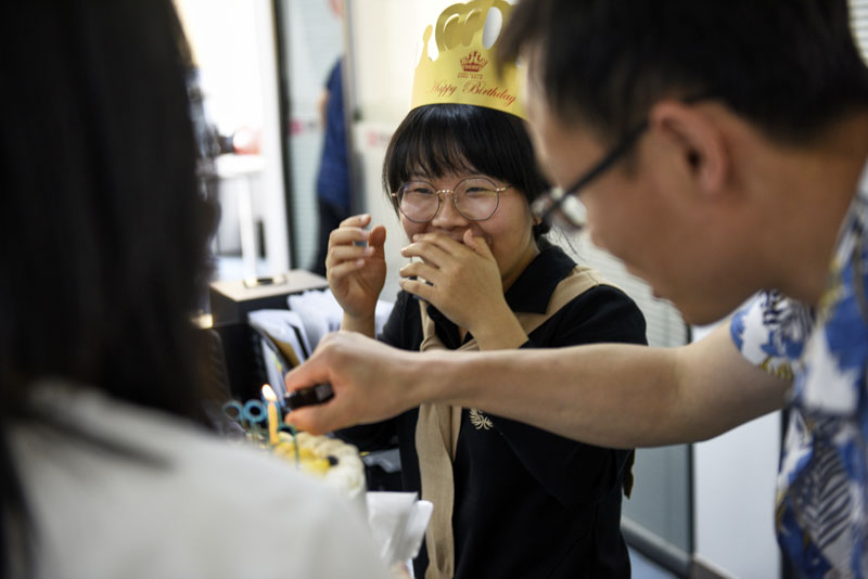 燈熄滅,蠟燭明,默默許愿,吹滅燭火。燈亮了,每個人的心也被點亮了。這對模范夫妻攜手一起切下蛋糕,我相信,此時此刻眾人的心中也有一個共同的愿望——愿團隊永遠團結(jié)出色、愿項目必優(yōu),勇爭第一。