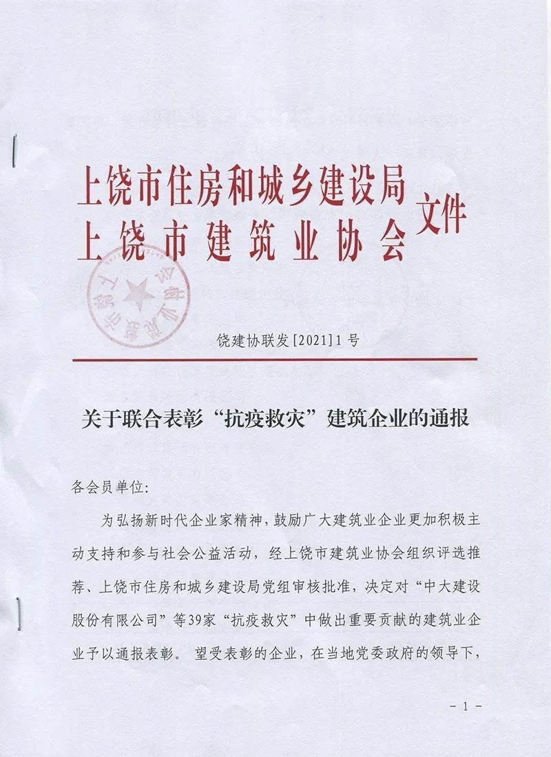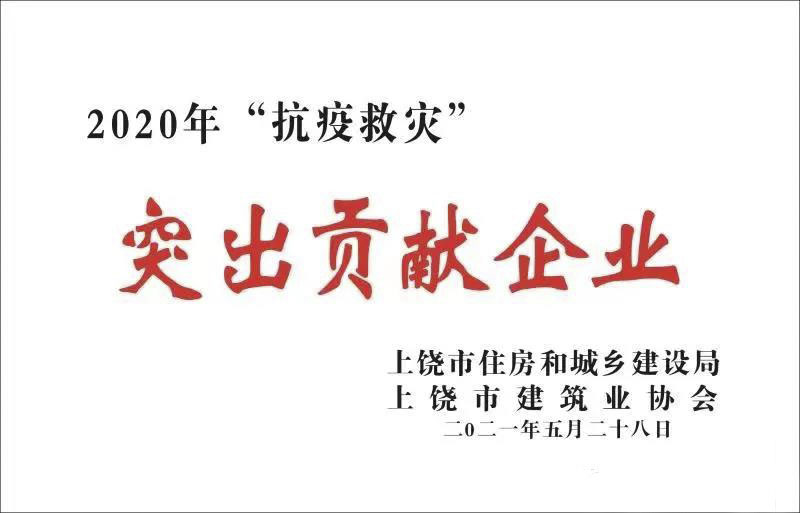 近日,經上饒市建筑業(yè)協(xié)會組織評選推薦、上饒市住房和城鄉(xiāng)建設局黨組審核批準,對“抗疫救災“中作出重要貢獻的建筑企業(yè)予以通報表彰。集團獲評“2020年抗疫救災突出貢獻企業(yè)“!